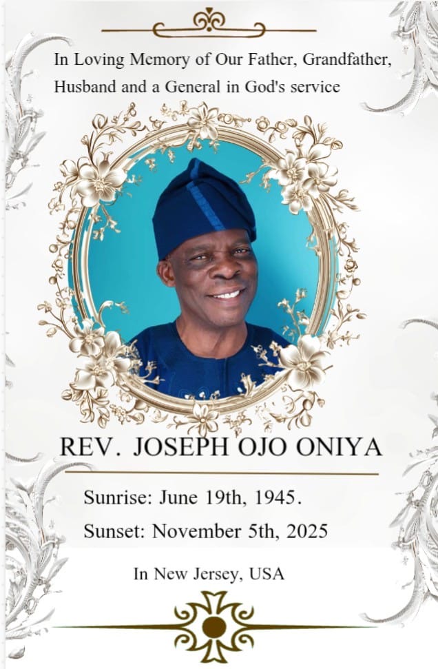 With heavy hearts but with gratitude to God, we announce the transition to glory of Reverend Joseph Ojo Oniya, who peacefully went home to rest on November 5th, 2025. Born on June 19th, 1945, Rev. Oniya lived a life dedicated to faith, prayer, family, and service, leaving an indelible mark on all who knew him. He was a pillar of strength and a spiritual mentor to many.